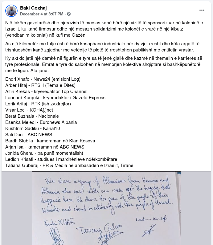 Në postimin e datës 04.12.2025, ai kritikon ashpër një grup gazetarësh dhe përfaqësuesish të medias shqiptare që kanë vizituar Izraelin, duke i etiketuar ata si bashkëpunëtorë të një “entiteti vrastar” dhe duke publikuar emrat e tyre, çka vlerësohet si akt denigrues dhe potencialisht nxitës i urrejtjes ndaj individëve të caktuar.