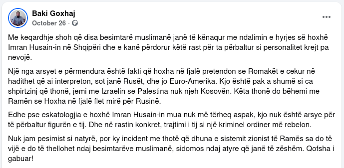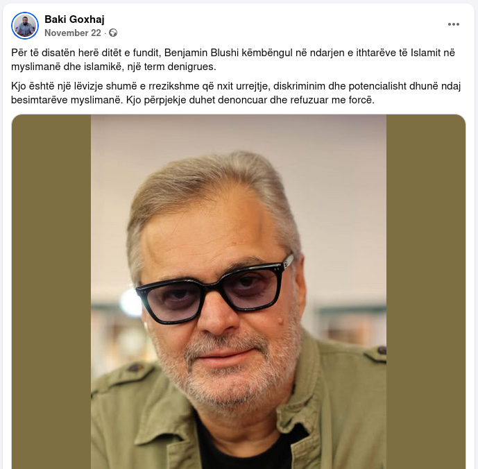 Në postimin e datës 26.11.2025, shtetasi Baki Goxhaj kundërshton publikisht përdorimin e termave “myslimanë” dhe “islamikë”, duke i cilësuar ato si nxitëse të urrejtjes dhe diskriminimit ndaj besimtarëve myslimanë dhe duke paralajmëruar rrezik për dhunë.