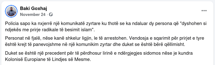 Në një postim tjetër të datës 24.11.2025, ai reagon ndaj një komunikate zyrtare të Policisë së Shtetit për ndalimin e dy personave të dyshuar për prirje radikale islamike, duke e konsideruar përmendjen e përkatësisë fetare si një akt diskriminues dhe si shkelje të lirisë së ndërgjegjes fetare.