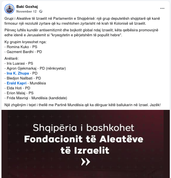 Në një postim të datës 26.10.2025, shtetasi Baki Goxhaj përfshihet në debate ku shpreh qëndrime të ashpra mbi konfliktin Izrael-Palestinë, duke përdorur gjuhë fyese dhe duke kundërvënë interesin kombëtar shqiptar me mbështetjen për Palestinën, si dhe duke justifikuar qëndrimet e tij mbi baza fetare dhe ideologjike.